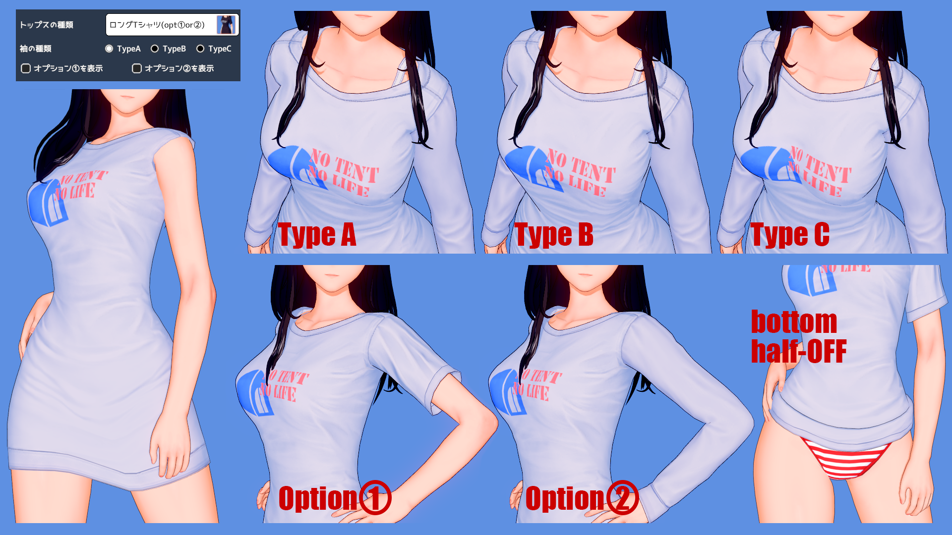 オプションや袖タイプといったギミックを付けたMODを作りたいという目的と手段がひっくり返ったモチベーションで作っています。ロングTシャツはシバスキーさんが乳テントとタイトスカートを組み合わせてコーデされていたのをモチーフに合体させてみました。