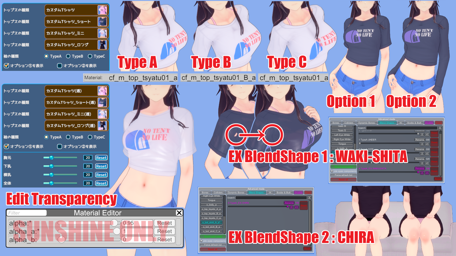 BlendShape対応の透け透けVer付き、カスタムTシャツシリーズ。SDはシバスキーさんとひよこ豆さんよりお借り。