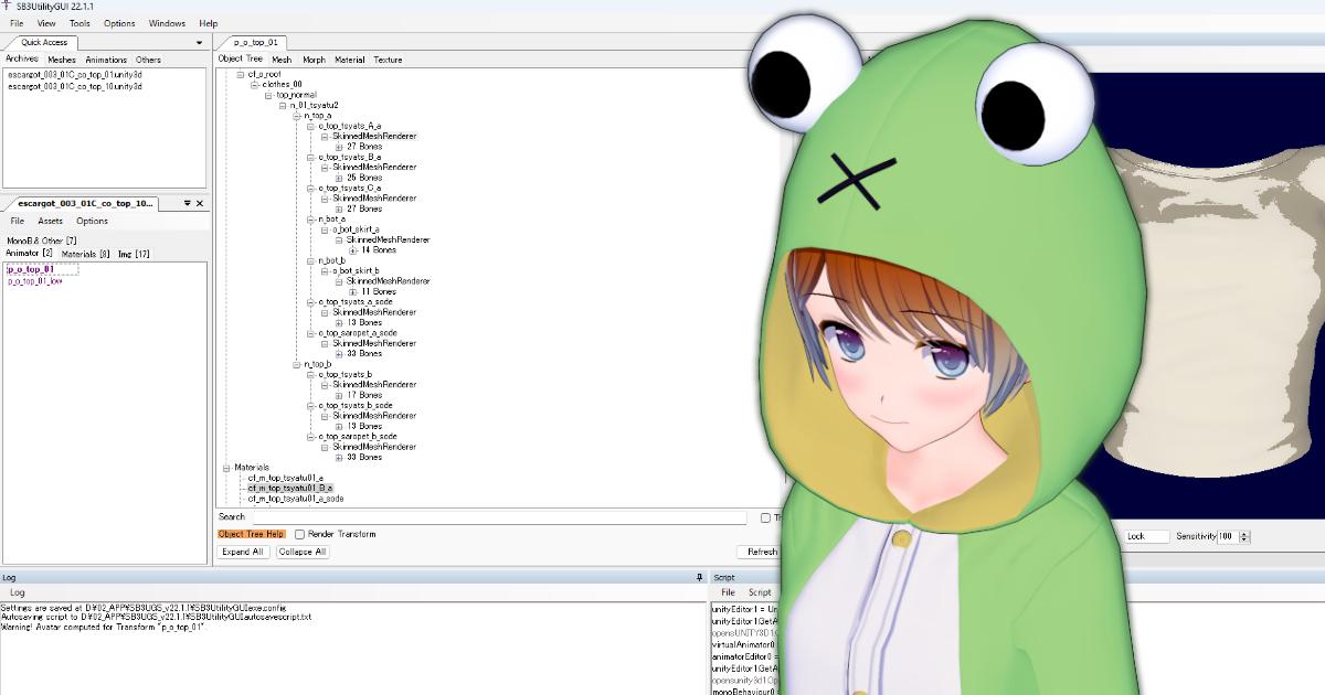 このため、MOD作りの1stステップとしては、適当な画像かリストのみのunity3dファイルからいらないデータを抹消し、元ネタになる公式衣装のAnimatorをコピペすることをお勧めします。